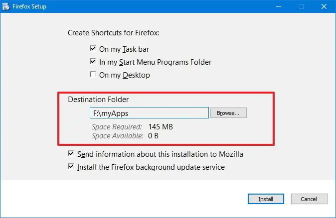 Örneğin Firefox yükleme işleminde kurulumu başlattığınızda, ‘Seçenekler (Options)’ butonuna tıklamanız gerekiyor ve daha sonra, yükleme dosyalarını kaydedeceğiniz ikincil sürücüyü seçmek için ‘Hedef Klasör (Destination Folder)’ başlığı altında ‘Gözat… (Browse…)’ butonuna tıklamanız gerekiyor.
