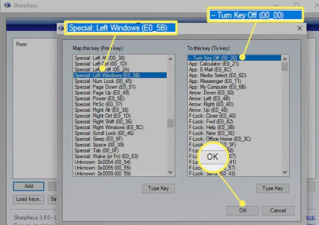 3-Sol sütundan Özel: Sol Pencereler “(E0_5B)” öğesini seçin, sağ sütunda “Turn Key Off (00_00)” öğesinin seçili olduğundan emin olun ve Tamam öğesini seçin.