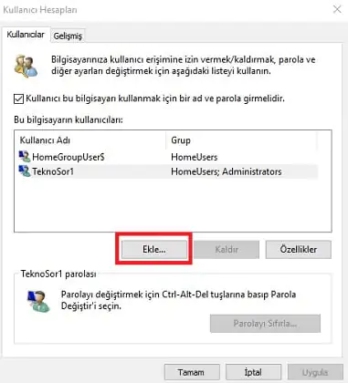 • Bir sonraki adımda ‘Kullanıcı hesapları’ penceresi karşımıza çıkıyor; ‘Ekle…’ butonuna tıklayalım.
