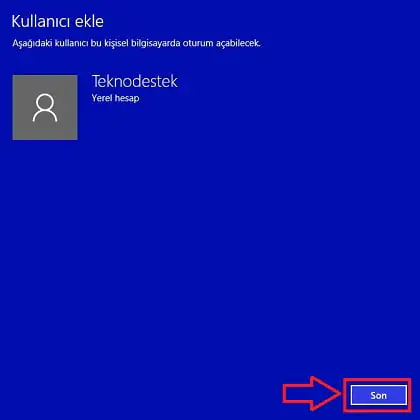 • İşlem tamamlandı. Bilgisayarımıza yeni bir kullanıcı (hesabı) ekledik. Yukarıdaki adımları uygulayarak siz de kolayca yeni bir kullanıcı ekleyebilirsiniz. Kullanıcıyı, yukarıdaki adımları izleyerek eklerseniz kullanıcı ‘users’ yetkisinde olacaktır. Yani ‘bilgisayar yöneticisi’ değil, ‘kısıtlı kullanıcı’ olacak; bilgisayarınız ile ilgili tam yetki gerektiren bazı işlemleri (program ekleme/kaldırma gibi) yapamayacaktır. Yeni eklenen kullanıcıya ‘Yönetici’ yetkisi vermek için, yönetici yetkisine sahip olan bir hesap ile giriş yapılmış olmalıdır. Konu ile ilgili ayrıntılı bilgiyi www.teknodestek.com.tr’de bulabilirsiniz.
