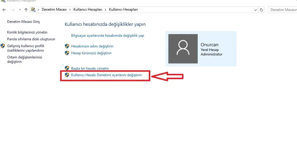 - Açılan pencerede, ‘Kullanıcı Hesabı Denetimi Ayarlarını Değiştirin’ linkine tıklıyoruz.