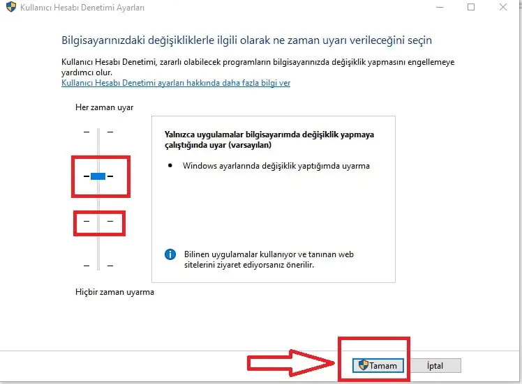- Açılan pencerede, sol tarafta bulunan ayar çubuğundan, Windwos‘ta yapacağımız değişikliklerde, sistemin bizi uyarmasını istediğmiz seviyeyi ayarladıktan sonra ‘Tamam’ butonuna tıklıyoruz.