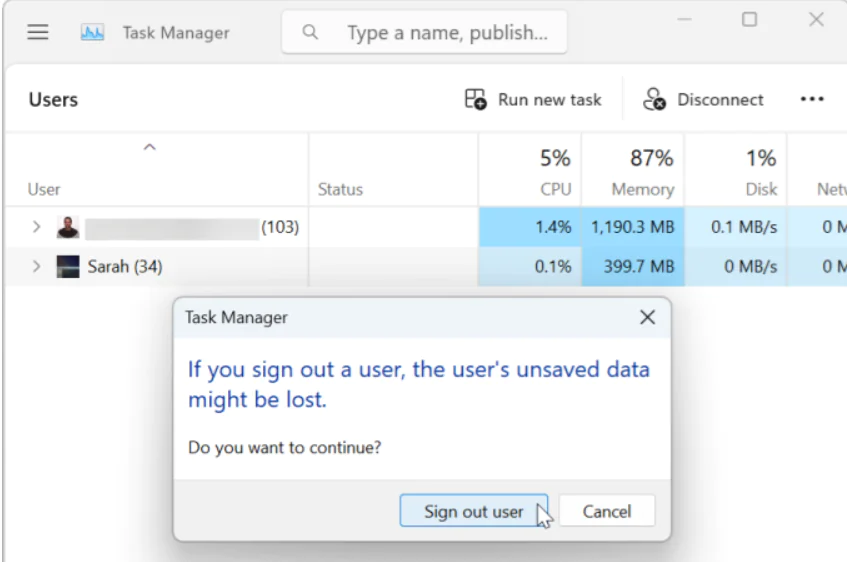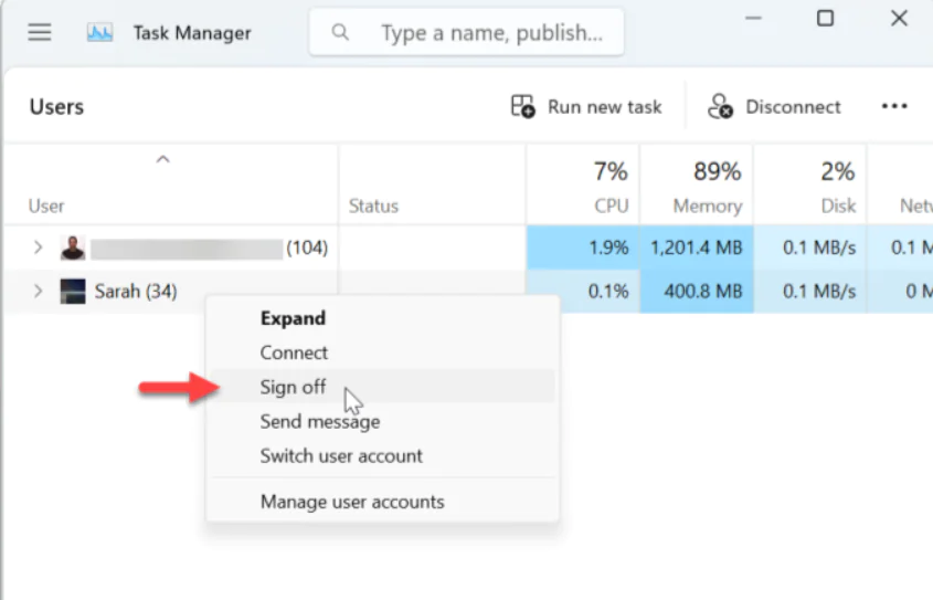 Windows 11‘de diğer kullanıcıların oturumunu kapatmanın basit bir yolu Görev Yöneticisi’dir.
