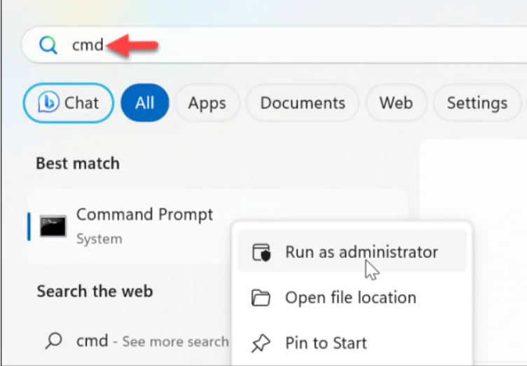 - CMD yazın, Komut İstemi’ne sağ tıklayın ve beliren menüden Yönetici Olarak Çalıştır seçeneğini seçin.