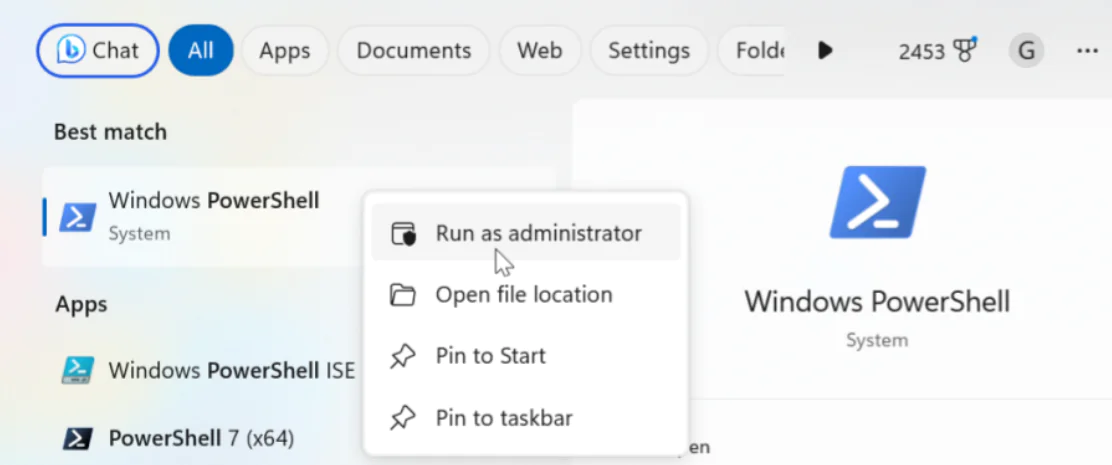 - PowerShell yazın, üstteki sonuca sağ tıklayın ve içerik menüsünden Yönetici Olarak Çalıştır seçeneğini seçin.