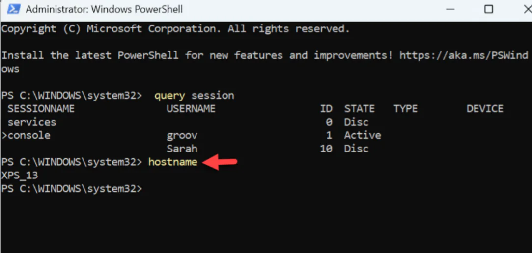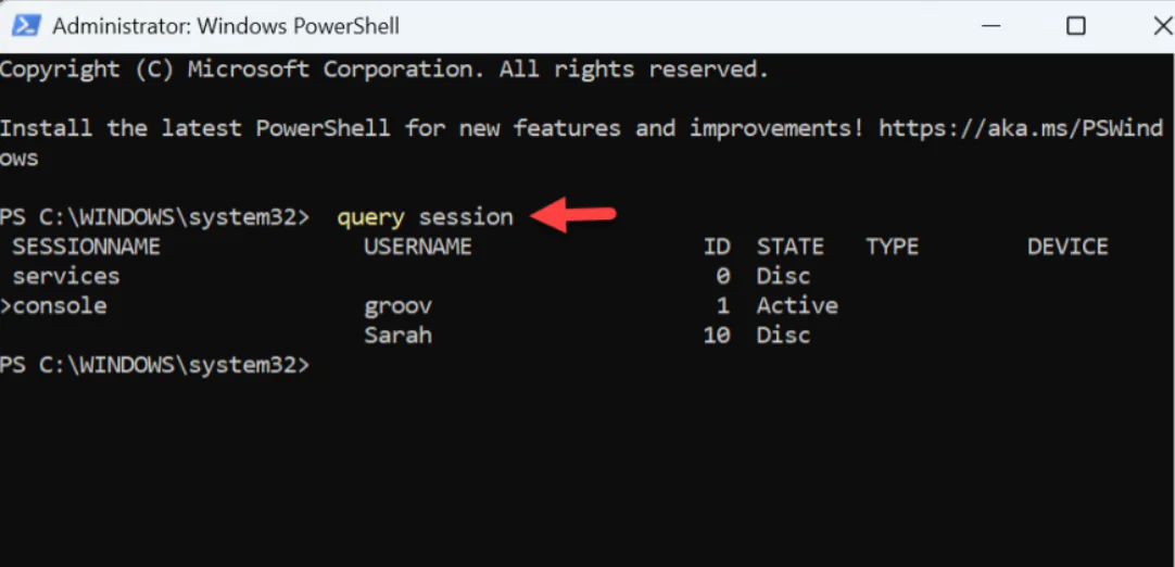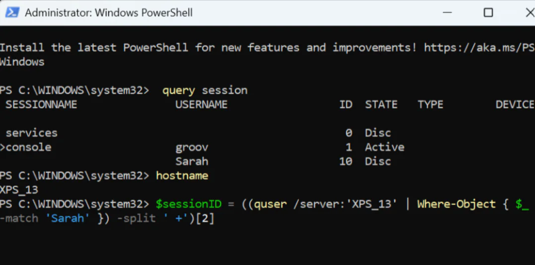 $sessionID = ((quser /server:’XPS_13′ | Where-Object { $_ -match ‘Sarah’ }) -split ‘ +’)[2]