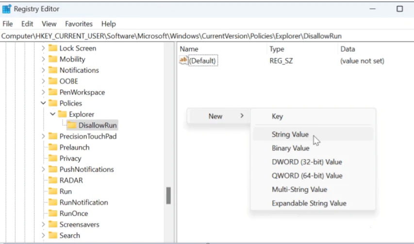 - Sağdaki DisallowRun klasöründe boş bir alanı sağ tıklayın ve New > String Value öğesini seçin.