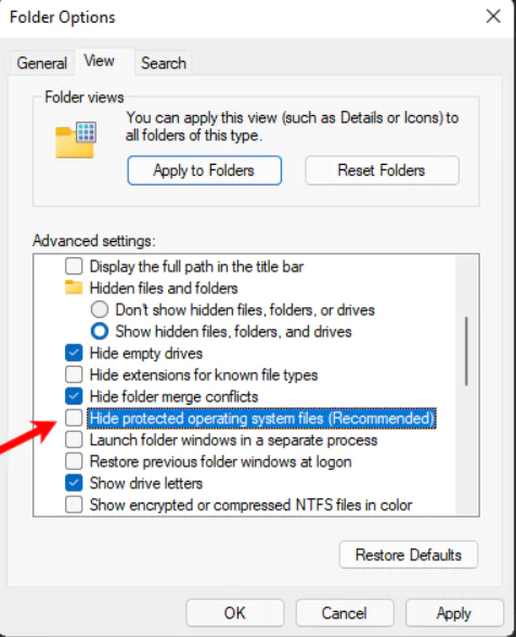 Görünüm sekmesi altındaki Korunan işletim sistemi dosyalarını gizle seçeneğini bulun.