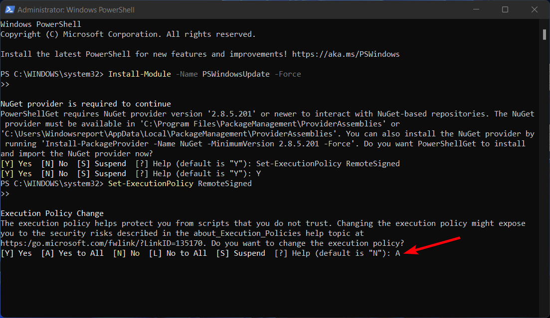 5. Yürütme değişikliği tamamlandığında, PSWindowsUpdate modülünü içe aktarmak için sonraki komutu yazın.