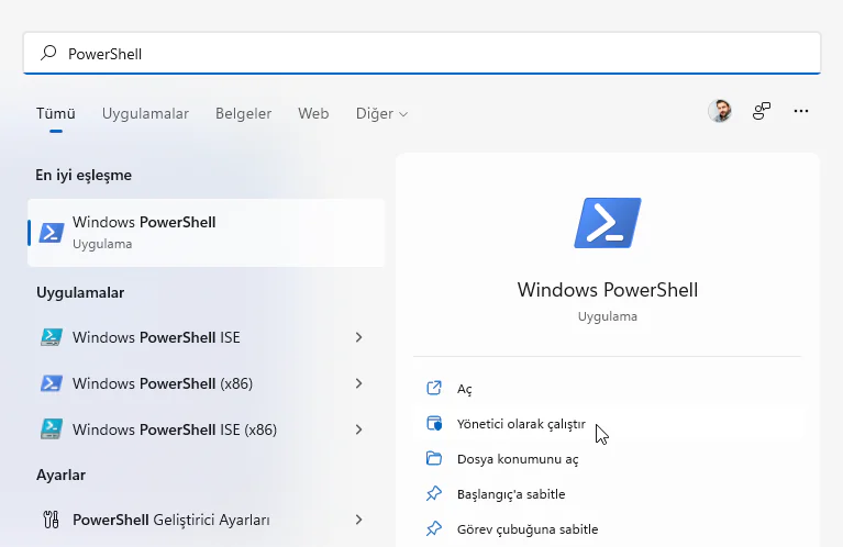 1. Başlat Menüsü’ne tıklayın ve PowerShell yazın ve Yönetici Olarak Çalıştır’ı seçin.