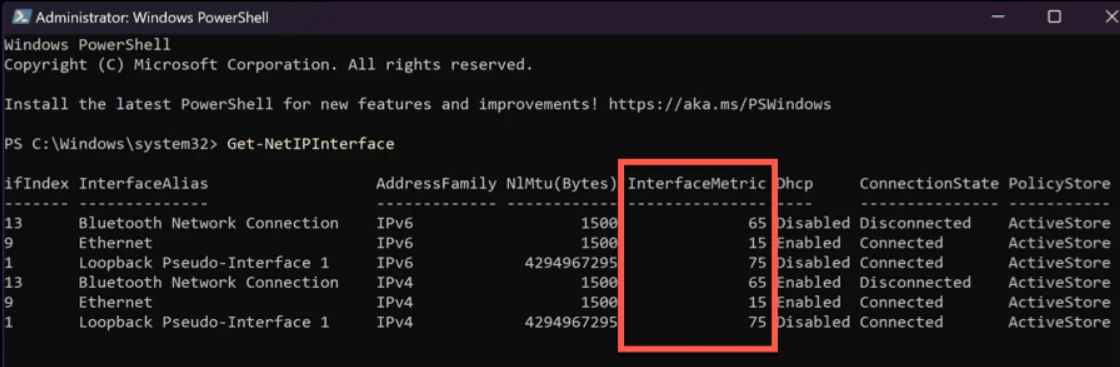 Aşağıdaki sonuçlar, bilgisayarınızda etkin olan her ağ bağdaştırıcısı hakkında bilgi verir. InterfaceMetric etiketli sütunun altında her birinin önceliğini göreceksiniz. Daha düşük bir sayı, bağdaştırıcının diğerlerine göre daha yüksek önceliğe sahip olacağı anlamına gelir.