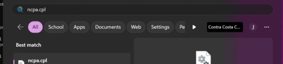 - Başlat’a tıklayın ve arama alanına ncpa.cpl yazın.