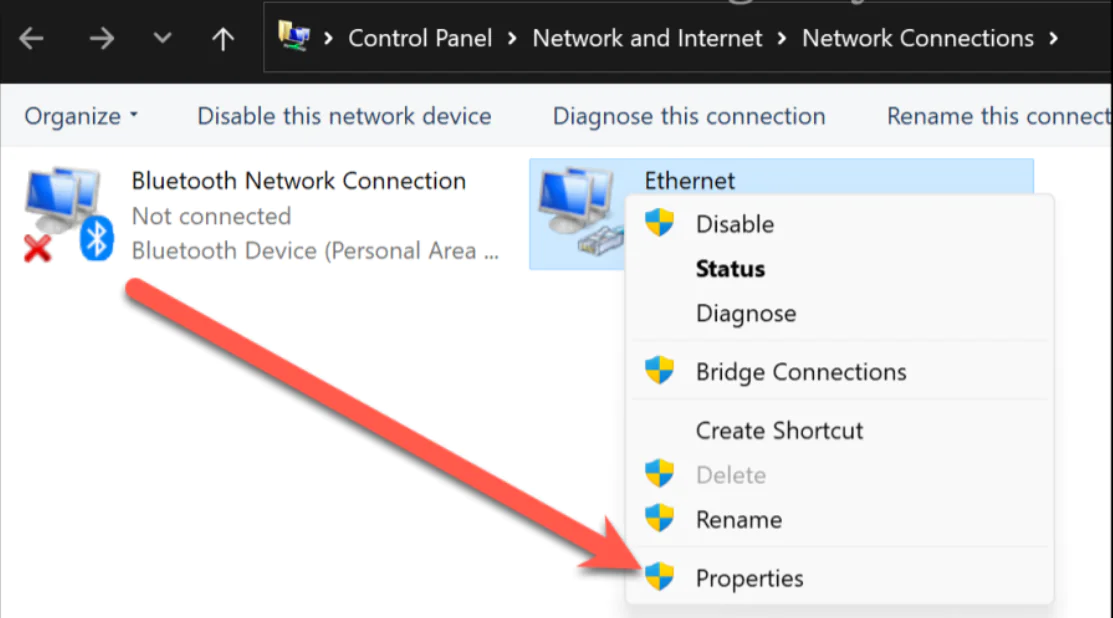 - Değiştirmek istediğiniz ağ bağlantısını sağ tıklayın ve ardından Özellikler’i seçin.