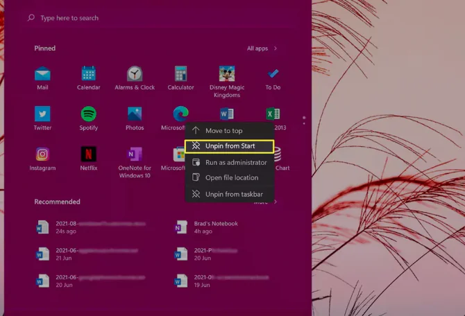 2-Başlat menüsünden bir uygulama simgesini kaldırmak için simgesine sağ tıklayın veya uzun basın ve “Başlattan Sabitle’yi” seçin.