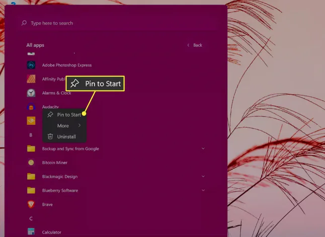 3-Windows 11’de Başlat menünüze bir uygulama eklemek için sağ üst köşedeki Tüm uygulamalar’ı seçin, uygulama simgesine sağ tıklayın ve Başlangıç’a Sabitle’yi seçin.