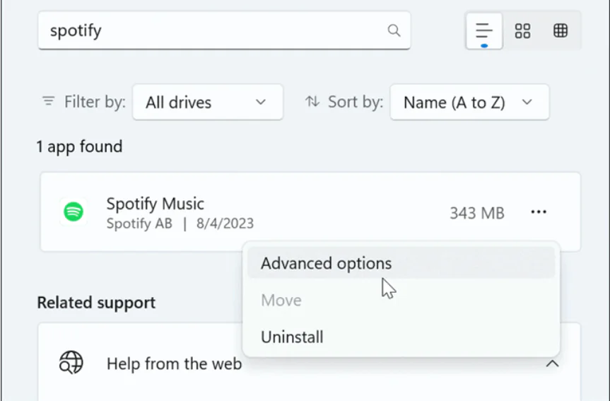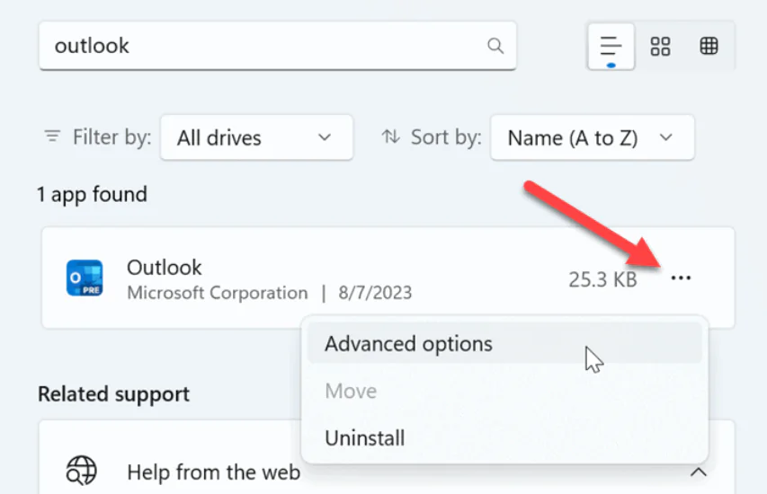 • Uygulamanın yanındaki üç noktalı düğmeyi tıklayın ve Gelişmiş seçenekler’i seçin.