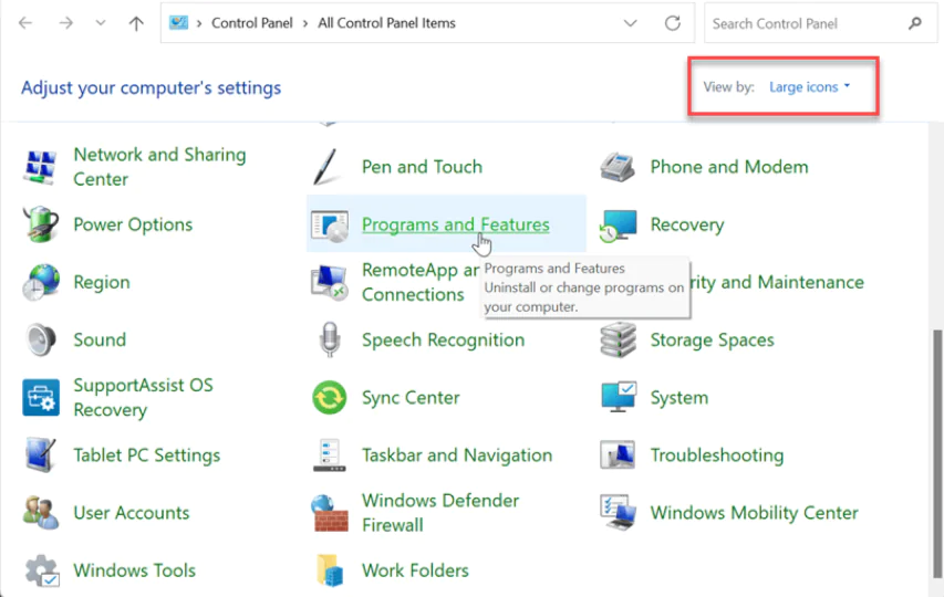 • Görünüm ölçütü açılır menüsünden Büyük simgeler’i seçin ve Programlar ve Özellikler’i tıklayın.