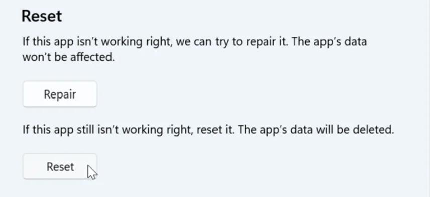 Sisteminizde çalışmayan Windows uygulamalarıyla ilgili bir sorununuz varsa sinir bozucu olabilir. Bu nedenle, uygulamayı yeniden yüklemeden önce Onar veya Sıfırla seçeneklerini deneyin. Bu, tam bir yeniden yükleme işleminde size zaman kazandıracak ve zahmetten tasarruf etmenizi sağlayacaktır.