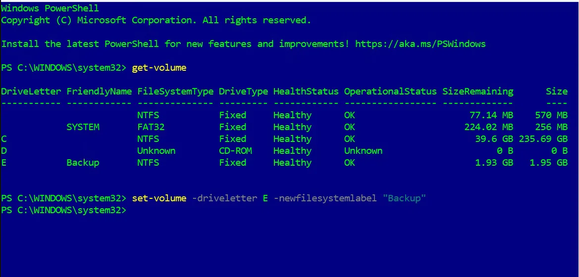 set-volume -driveletter E -newfilesystemlabel "Backup"