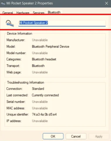 - Özellikler penceresinde Bluetooth sekmesini açın.