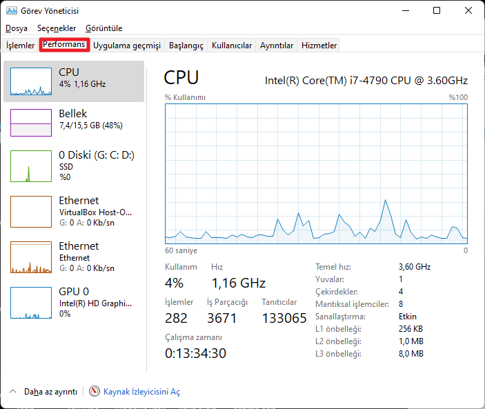 - Görev Yöneticisi’ndeyken Performans sekmesine tıklayın.