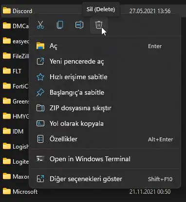 - Discord klasörüne gidin, sağ tıklayın ve Sil’i seçin.