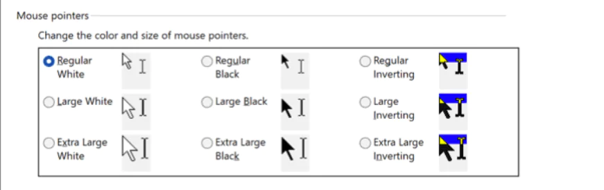 Ayrıca Denetim Masası’nda fare işaretçisinin stilinde de değişiklik yapabilirsiniz. Bu, Kontrol Panelinde özel bir renk seçeneği olmamasına rağmen siyah, beyaz ve ters çevrilmiş seçenekler arasında seçim yapmanızı sağlar. Ayrıca normal, büyük veya ekstra büyük fare boyutları arasından seçim yapabilirsiniz.