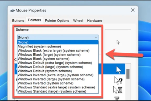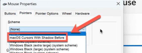 - Şema açılır menüsüne tıklayın ve yeni kurulan imleç şemasını seçin.