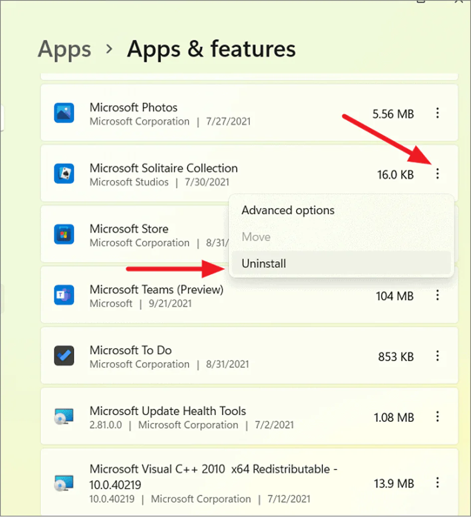 Ardından, uygulamalar listesinde istenmeyen uygulamayı bulun, uygulamanın yanındaki üç noktalı menü düğmesini tıklayın ve uygulamayı kaldırmak için “Kaldır”ı seçin.