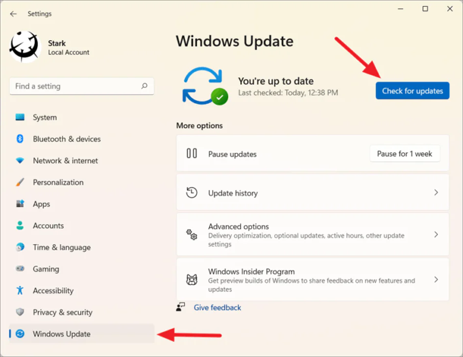 Ayarlar uygulamasında, sol panelin altındaki ‘Windows Update’ bölümünü tıklayın. Ardından, sağ bölmedeki ‘Güncellemeleri kontrol et’ düğmesini tıklayın. Mevcut herhangi bir güncelleme varsa, dosyaları indirip yüklemesine izin verin. Ardından, gerekirse bilgisayarınızı yeniden başlatın.