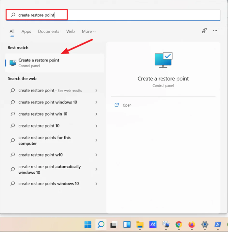Başlat menüsünü tıklayın, ‘Geri yükleme noktası oluştur’ yazın ve en uygun sonucu seçin.