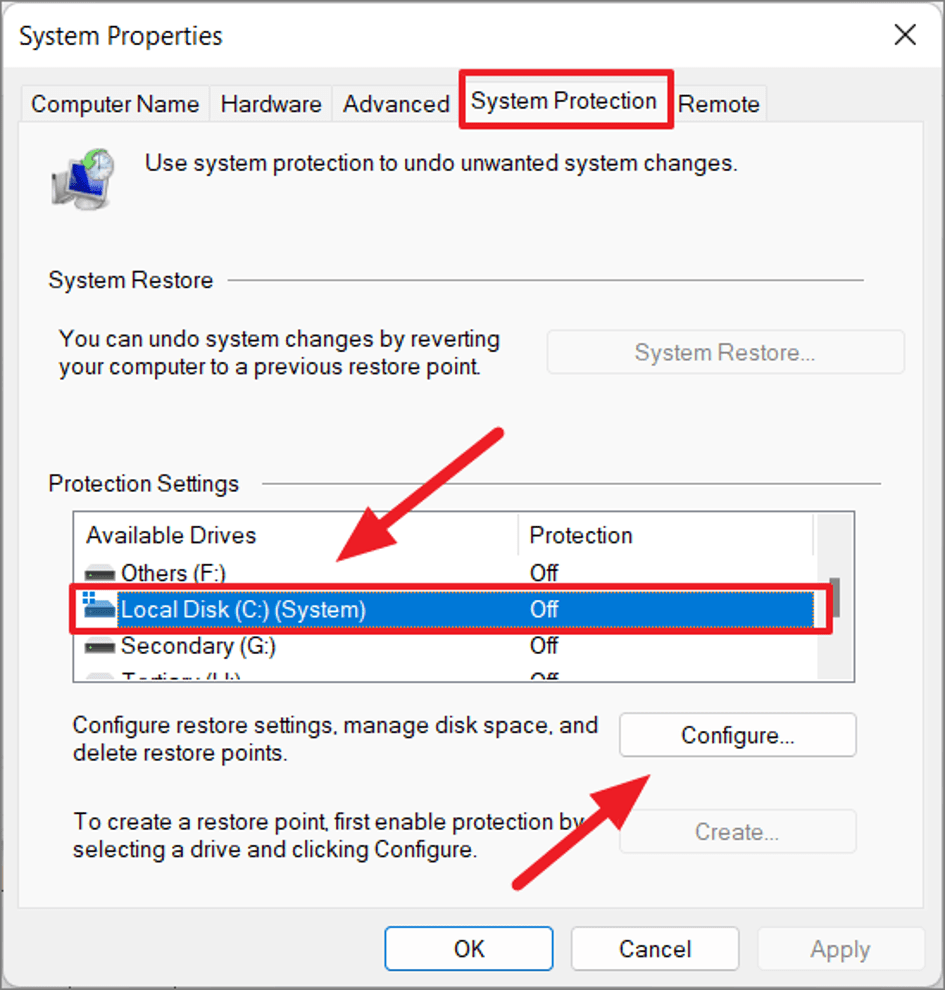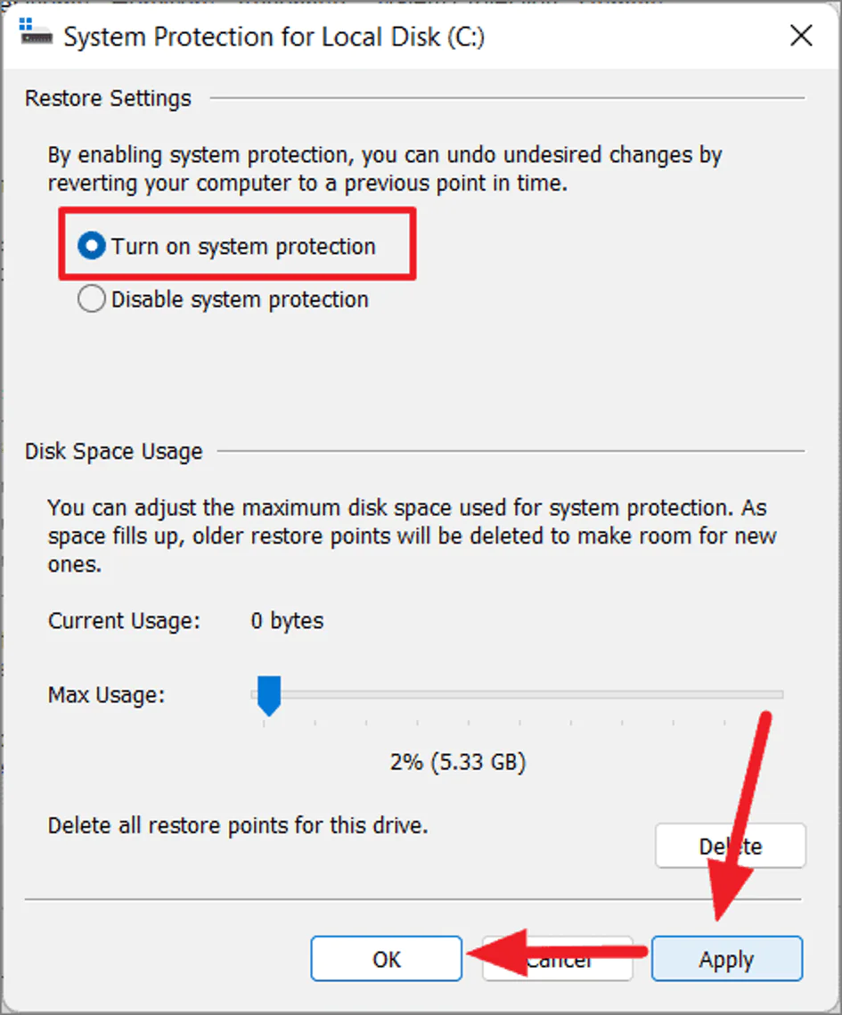 Ardından, “Sistem korumasını aç”ın yanındaki radyo düğmesini seçin, “Uygula”yı tıklayın ve “Tamam”ı seçin.