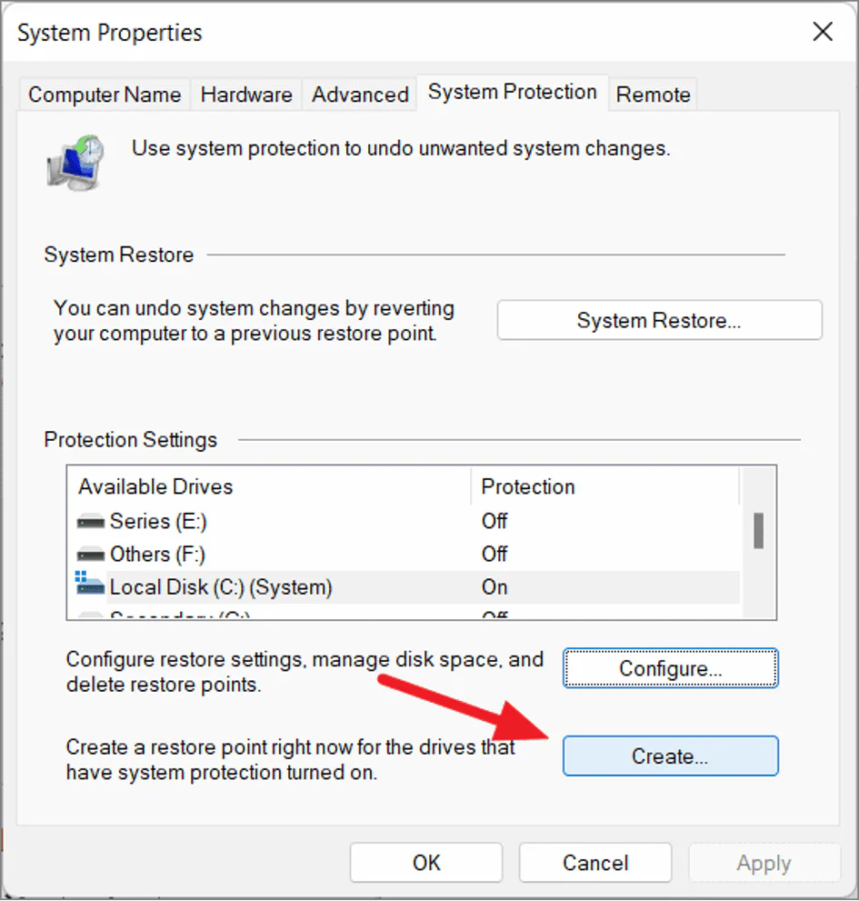 Windows 11 sisteminizin şişmesini azaltmadan önce Windows geri yükleme noktası oluşturmak her zaman daha iyidir. Şans eseri bir şeyler ters giderse ve sistem yapılandırmalarını bozarsanız veya yapılan bazı değişiklikleri beğenmezseniz, oluşturduğunuz geri yükleme noktasını kullanarak her zaman önceki duruma geri dönebilirsiniz. Windows Geri Yükleme Noktasını şu şekilde oluşturabilirsiniz: