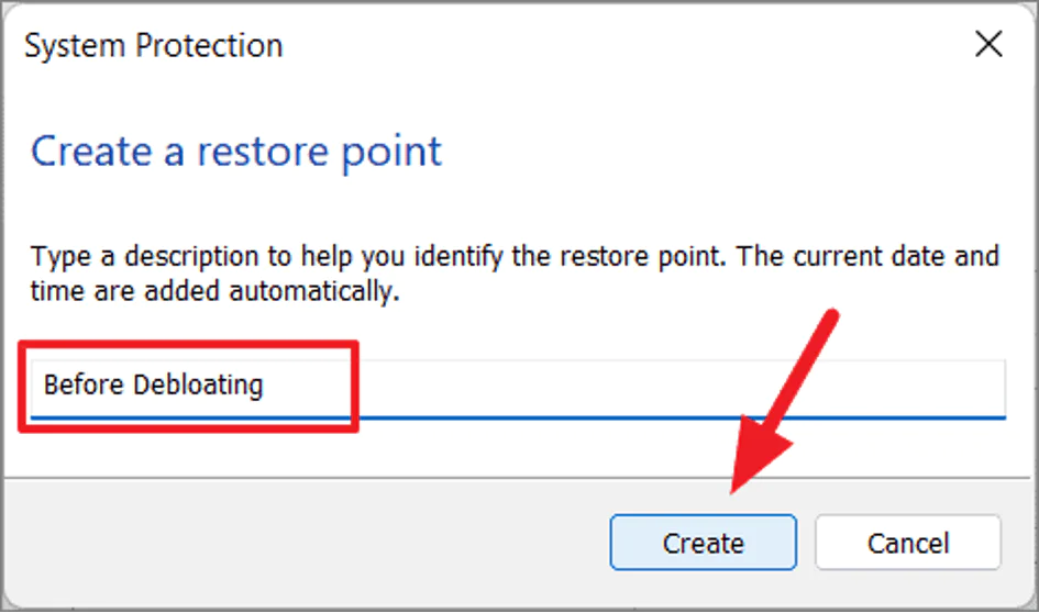 Geri yükleme noktanız için bir ad veya açıklama yazın ve tekrar ‘Oluştur’ düğmesini tıklayın.
