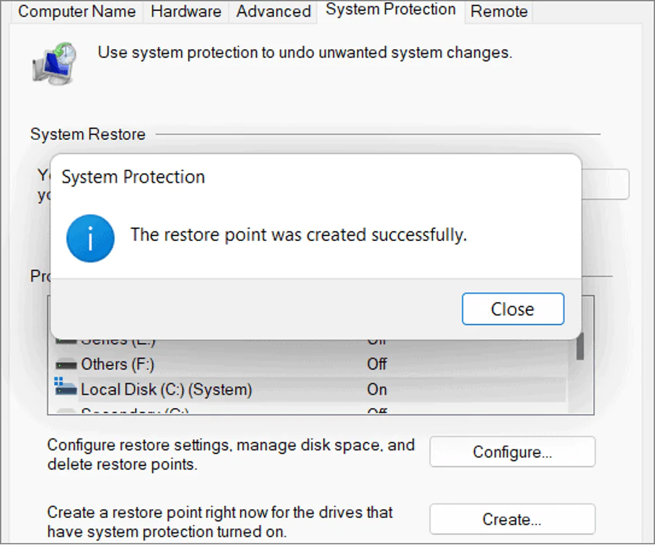 Geri yükleme noktası oluşturulduktan sonra bir başarı mesajı göreceksiniz.