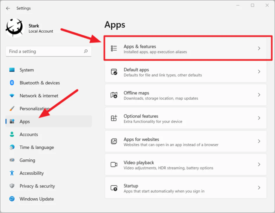 Ayarlar aracılığıyla kaldırmak için Windows Ayarları uygulamasını açın ve sol paneldeki ‘Uygulamalar’a gidin ve sağ bölmeden ‘Uygulamalar ve özellikler’ seçeneğini seçin.
