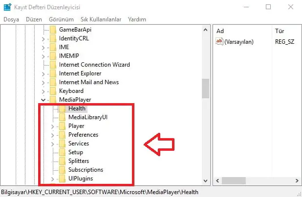 • Kayıt defteri açılacak. HKEY_CURRENT_USER → SOFTWARE → Microsoft → Media Player klasörüne ulaşalım ve tüm alt klasörlerini silelim.