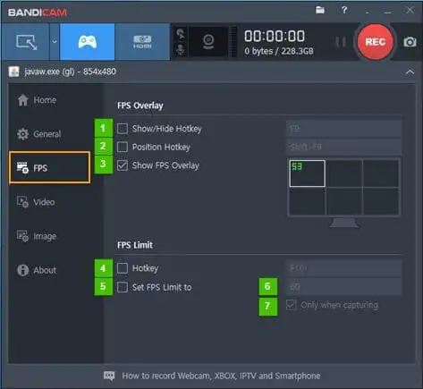 Bu, oyun içi FPS’ lerini kaydetmek veya sadece görmek isteyen tüm oyuncular için çok faydalıdır Bandicam’i kurduktan ve başlattıktan sonra, program ekranınızın köşesinde FPS sayısını gösterecektir. Bu programın maksimum kare hızı 120 FPS’dir.