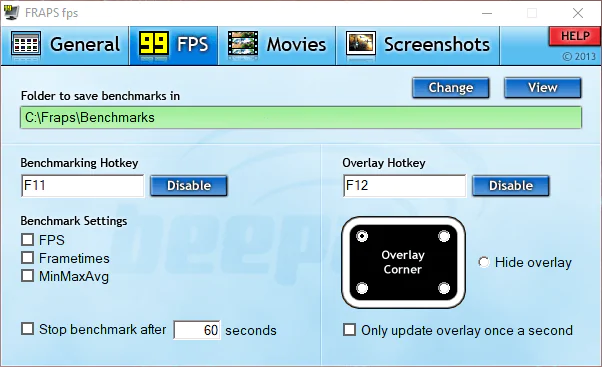 Fraps, sayacın ayarlarını yapılandıra bileceğiniz bir FPS sekmesi içerir. FPS sayacını herhangi bir köşeye dahil etmeyi seçebilirsiniz. Ayrıca, FPS sayaç kaplamasını özelleştirilebilir bir kısayol tuşuyla açıp kapatabilirsiniz.