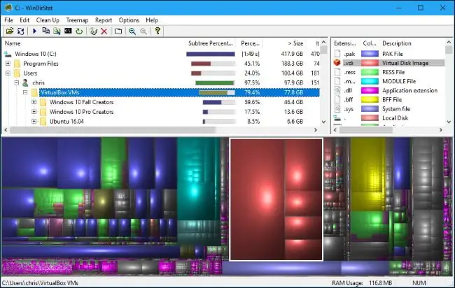 Taramayı bitirdikten sonra üç bölme göreceksiniz. En üstte, en çok alanı azalan sırayla kullanan klasörleri gösteren bir dizin listesi var. Alt kısımda, alanın ne kullanıldığına ilişkin renk kodlu bir görünüm gösteren bir “ağaç haritası” görünümü var. Sağ tarafta, hangi dosya türlerinin en fazla alanı kullandığıyla ilgili istatistikleri gösteren bir dosya uzantısı listesi bulunmaktadır. Aynı zamanda pencerenin altında görünen renkleri açıklayan bir efsane olarak da işlev görür.