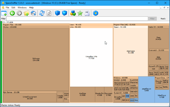 Farklı bir şey arıyorsanız SpaceSniffer’ı deneyin. SpaceSniffer, WinDirStat’ta bulunan dizin listesine sahip değil. WinDirStat’ın arayüzündeki alt ağaç haritası görünümü gibi klasörleri ve içindeki dosyaları göreceli boyutta gösteren grafiksel bir görünümdür.