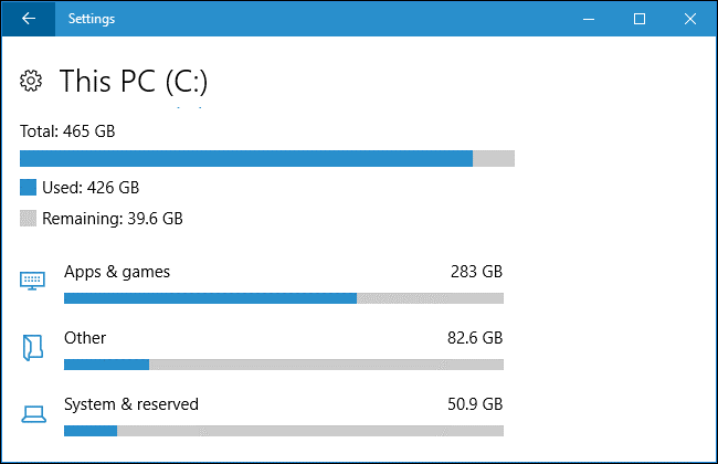 Windows 10 bazı durumlarda size yardımcı olabilecek bir depolama kullanım aracına sahiptir. Yukarıdaki araçlar gibi klasik bir disk alanı analizörü değil, ancak bazı benzer özelliklere sahiptir.