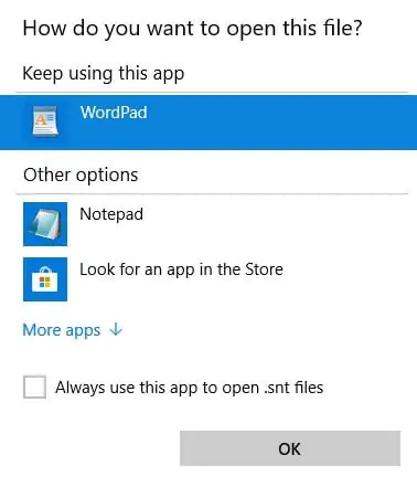• snt dosyasına sağ tıklayın ve doğrudan aşağıda gösterilen pencereyi açmak için Şununla aç> Başka bir uygulama seçin öğesini seçin .