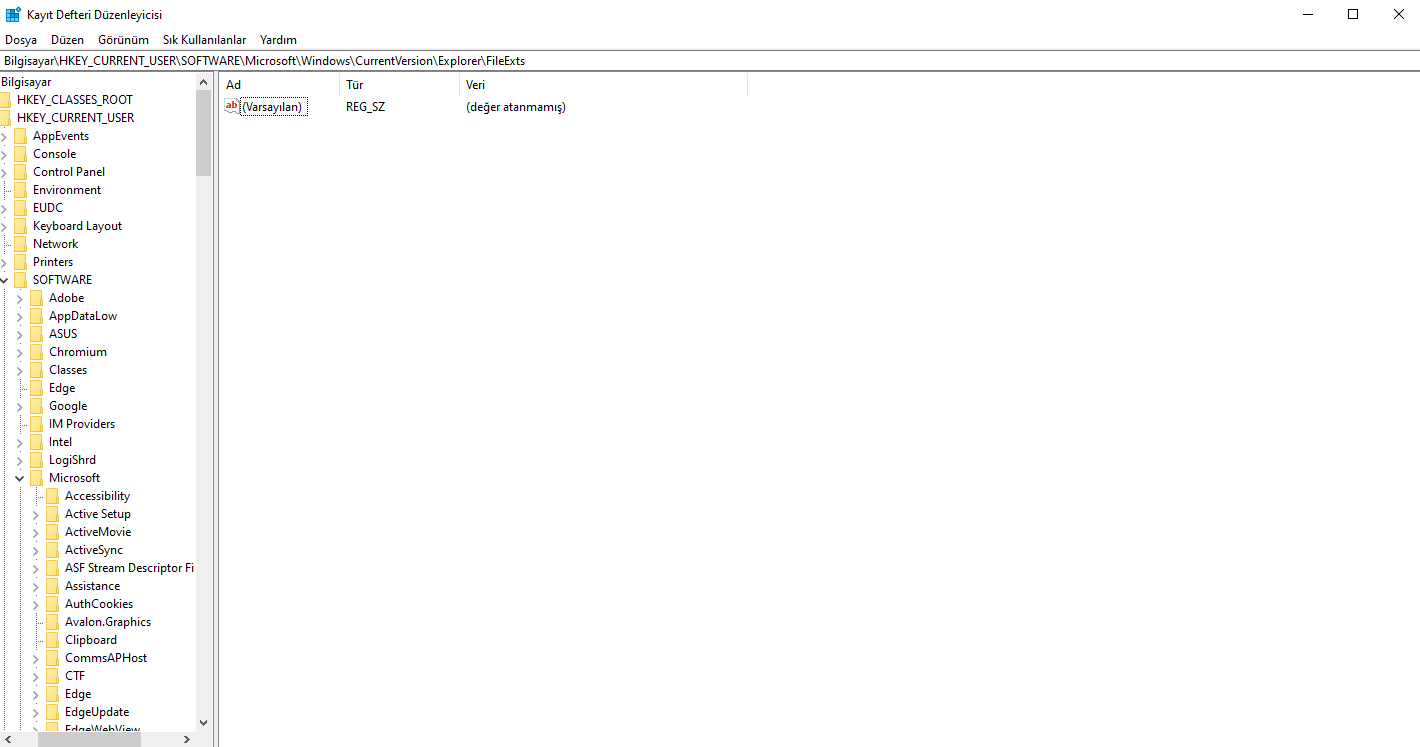 Kayıt Defteri Düzenleyicisi, bu işlemi dosya türünde yapmanıza imkan sağlar. Ancak her dosya uzantısı için işlemi tekrarlamanız gerekebilir.