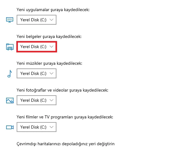 Yeni uygulamalar, belgeler, müzik, fotoğraflar ve videolar (ekran görüntüleri dahil), filmler ve TV şovları ve çevrimdışı haritalar için varsayılan kaydetme konumunu bulun. Eski konumu, dosyalarınızı kaydetmeyi planladığınız konumla değiştirin, ardından kaydetmek için Uygula’yı ve ardından değiştirin. Kaydedilen dosyalar yeni hedefe kaydedilecektir.