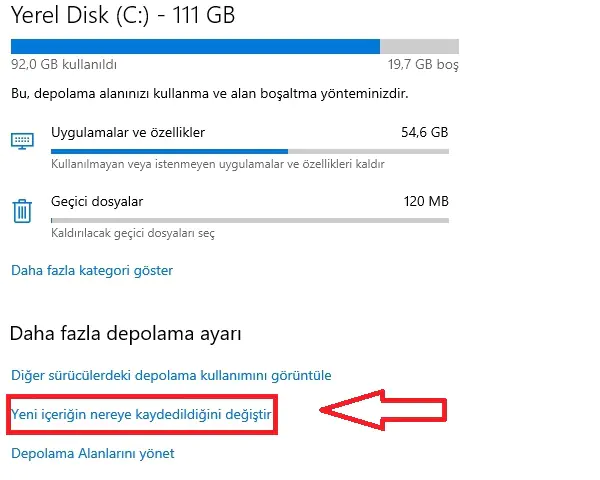 • Ayarlar -> Sistem -> Depolama -> Depolama yönetimi -> Gelişmiş depolama ayarları -> Yeni içeriğin kaydedildiği yeri açın.
