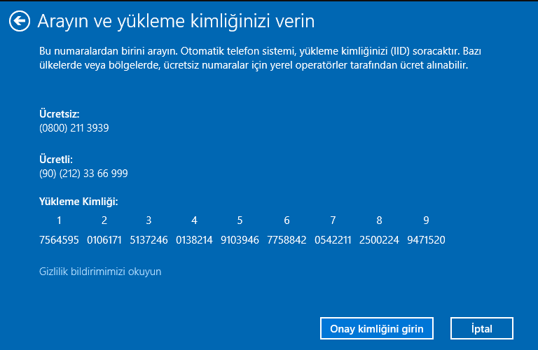 Windows 10 lisansımızı etkinleştirmek istediğimiz ve lisans kodunu girdiğimizde aldığımız bu lisans kodu farklı bir cihazda kullanılmıştır şeklinde hata aldığımız da telefonla etkinleştirme seçeneğini kullanarak lisansımızı etkinleştirebiliriz. Verilicek olan yükleme kimliği sayesinde bilgisayarımızın lisansını etkinleştirebiliriz.