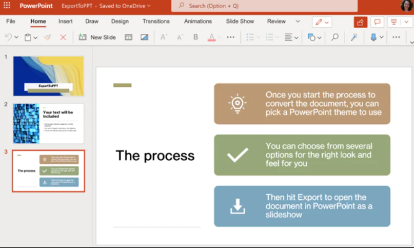 Belki Word’de kaydettiğiniz metni kullanarak sununuzu oluşturmaya hızlı bir başlangıç ​​yapmak istersiniz. Veya belgenizin bir PowerPoint slayt gösterisi olarak daha iyi sunulacağını fark etmiş olabilirsiniz. Web üzerinde Word ile belgenizi kolayca dönüştürebilirsiniz.