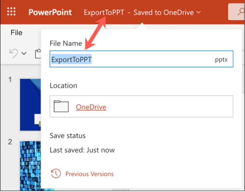 Sunum, Microsoft Word belgenizle aynı adla otomatik olarak OneDrive’a kaydedilecektir. Belgenizi adlandırmadıysanız, slayt gösterisinin Belge 1 gibi varsayılan bir adı olacaktır. Sol üst köşedeki adı tıklayın ve ona yeni bir dosya adı verin.
