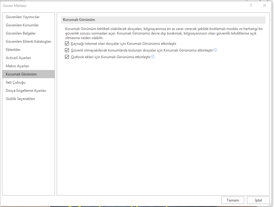 • Sayfanın sağ tarafında açılan pencerede 3-adet seçenek bulunmakta. En üstte ‘Kaynağı internet olan  dosyalar için Korumalı Görünümü etkinleştir’ seçeneği var; Bu seçeneğin solundaki kare kutucuktan tik (check) işaretini kaldırarak bu sorunu çözebilirsiniz. Tabi, kaynağını bilmediğiniz dosyalar için bu seçeneğin seçili olmasının güvenlik açısından önemli olduğunu da belirtmiş olalım.